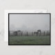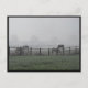 Chevaux broutant un matin brumeux.