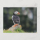 Un petit macareux ou perroquet de mer comme on les appelle localement, assis sur un rocher surplombant une goutte d'eau avec en arrière-plan une falaise vertigineuse avec des oiseaux nicheurs.