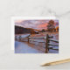 Cette photo présente une grange rustique recouverte de neige devant un beau coucher de soleil sur un ranch du Colorado.