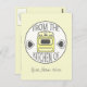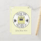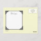 Carte postale recette illustrant un arrière - plan blanc cassé et un cercle blanc au centre. Illustration d'un poêle jaune rétro avec un coeur de chaque côté et texte au-dessus et au-dessous qui dit "De la cuisine de" cercle intérieur. Personnalisez avec votre nom en bas. En face, un rectangle blanc avec des bords grises et des angles de photo à l'ancienne à droite. Le texte à l'intérieur du rectangle dit "Recette". Recherchez les articles correspondants chez Jill's Paperie.