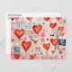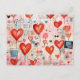 Une carte postale avec un motif de style média mixte amusant. De grands coeurs rouges et diverses formes aléatoires dispersés autour en faisant un motif délicieusement mignon.