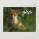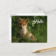 Une carte postale avec une photographie représentant un petit renardeau mignon avec une fourrure rouge et blanche. Entouré de feuilles et d'herbes vertes luxuriantes.