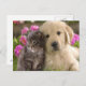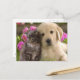 Ce joli petit chiot de repérage doré et un chaton gris mignon se tenant dehors sur l'herbe verte avec une fleur rose derrière eux.