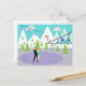 Cette carte postale Retro Winter Ski Resort a quelque chose pour tout le monde. Le dessin animé pittoresque présente une chaîne de montagnes enneigée avec des cèdres verts. Un skieur solitaire, en rouge, orange et bleu roi, se balade sur la plus haute montagne. La neige continue de tomber des nuages dans le ciel turquoise. On peut voir les silhouettes de gens heureux qui se baladent dans les gondoles des remonte-pentes. Perché au-dessus des arbres, il y a un chalet de ski moderne du milieu du siècle, surélevé. A travers les murs en verre, on peut voir une beauté aux cheveux foncés reposant dans un fauteuil aux oeufs violets. Elle porte un chandail vert, un pantalon bleu marine et un lourd moulage blanc sur une jambe. Ne te sens pas trop désolé pour elle. Elle profite de la chaleur d'une cheminée en forme de cône verte d'olive avec un feu rugissant. Elle a aussi une vue magnifique de deux patineurs romantiques sur une patinoire gelée et violette. L'homme du duo porte une combinaison noire avec un col jaune. Ses mains sont enveloppées autour de la taille de son partenaire. C'est une rousse magnifique dont les cheveux sont en queue de cheval. Elle porte une jupe bleue glace et une jupe verte en mousse de mer courte, gonflable. Ils ont le temps de vivre, mais espérons qu'ils remarquent la fissure dans la glace.