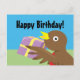 Une belle carte postale d'anniversaire de caricature ornée d'un rouge et un rouge rouge rouge (variété anglaise) tenant un cadeau violet et jaune contre un ciel bleu. Il dit Joyeux anniversaire