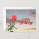 Une rose rose unique sur une tige verte feuillue, est tenue contre un ciel de coucher de soleil. Ciel doré en bas et ciel bleu-gris en haut. Des nuages roses et gris sont dispersés dans le ciel. "Joyeux Anniversaire" est écrit en texte rose avec une ombre portée noire (peut être modifié selon vos souhaits).