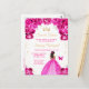Cette invitation d'anniversaire élégante et glamour pour un sweet sixteen présente une belle princesse à la peau foncée dans une robe de bal rose vif. Le texte combine une écriture manuscrite et des polices sans empattement modernes pour un look chic et sophistiqué. Les arrangements floraux, le papillon et les confettis dorés créent le mélange parfait de rustique et de chic.