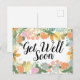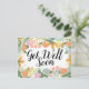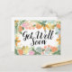 Belle source fleurie dans le feuillage fleuri, avec des roses roses et pêche, différents plantes fantaisistes et deux porte-bonheur. Jolie carte de voeux fleurie colorée "Get Well Bientôt".