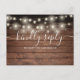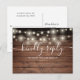 Une carte RSVP rustique avec de jolies lampes à cordes et une typographie chic sur un arrière - plan de panneaux de bois. L'inverse vous donne vos détails et une demande amusante de chant invité. Conçu par Thisisnotme©