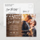 Notre Rustic Country String Lights Photo Save the Date Postcard est la meilleure façon d'annoncer votre prochain mariage. Cette carte postale présente un design rustique charmant avec des lampes à cordes et un espace pour votre photo fiançailles préférée. Vous pouvez utiliser l'outil de design de Zazzle pour customiser ce modèle et créer une carte unique de sauvegarde à jour qui reflète votre style personnel. Ce produit est idéal pour les couples qui veulent faire une impression durable sur leurs clients mariages avec une carte personnalisée et mémorable.