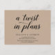 Il s'agit de la moderne minimaliste rustique Kraft design thème, en fonte noire, invitation de mariage Rescheduled (repoussé / report) carte postale (Une torsion dans les plans). C'est la façon parfaite et élégante de faire le faire-part reprogrammé à vos amis et votre famille.