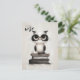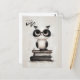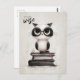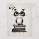 Une carte postale de retour à l'école avec un texte "à l'étude" personnalisable avec l'illustration d'une chouette en peluche debout sur une pile de livres.
