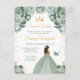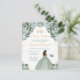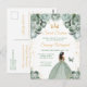 Cette invitation d'anniversaire élégante et glamour pour un sweet sixteen présente une belle princesse à la peau foncée dans une robe de bal vert sauge. Le texte combine une écriture manuscrite et des polices sans empattement modernes pour un look classe et sophistiqué. Les arrangements floraux, le papillon et les confettis dorés créent le mélange parfait de rustique et de chic.