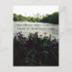 Une belle vue sur le lac à Central Park avec des iris fleuris et des bâtiments en arrière-plan.