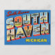 C'est une carte postale classique de style vintage représentant la phrase "Greetings from South Haven, Michigan". Les grandes lettres stylisées de SOUTH HAVEN contiennent chacune une scène ou un monument unique de la ville, notamment son phare, ses plages et ses bateaux sur l'eau. Le design a une atmosphère nostalgique des années 50 avec sa palette de couleurs rétro et sa police en gras, ce qui la rend parfaite pour des produits comme des cartes postales, des affiches et des t-shirts pour quiconque aime l'art du voyage vintage ou la belle région de South Haven.
