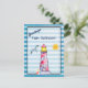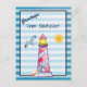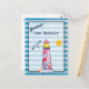 Une carte postale qui dit : Salutations de Nantuckets. Placez-vous sur un arrière - plan rayé bleu. Un phare rayé rouge et un ballon de plage sont disposés sur le dessus d'un arrière - plan blanc transparent. Un soleil souriant et une mouette volante au loin.