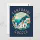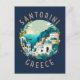 Illustration de Santorin Greece en cercle avec un texte en détresse. Santorin est immédiatement reconnaissable à ses bâtiments blanchis à la chaux en forme de cube ornés d'accents bleus, de falaises escarpées et de couchers de soleil de mandarine qui illuminent le ciel et la mer.