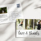 Une photo moderne vous remercie carte postale conçue pour accueillir trois de vos photos mariages préférées alignées côte à côte. "Amour et merci" apparaît en bas dans le script de style manuscrit noir. Personnalisez avec vos noms et/ou la date mariage en dessous. Les cartes postales sont inversées pour montrer votre adresse de retour avec suffisamment d'espace pour l'adressage du destinataire, ainsi qu'un message pré-imprimé et une photo supplémentaire en option. Si vous préférez ajouter un message manuscrit, supprimez simplement l'exemple de texte affiché.