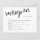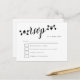 Un moyen pratique pour vos invités à RSVP à vos invitations est par carte postale avec vos coordonnées déjà là pour qu'ils puissent simplement compléter le front et le retourner dans le poste à vous. Ce design élégant a RSVP en écriture minuscule avec des swashes sur la première et la dernière lettre avec 6 feuilles en forme de coeur à chaque extrémité. Le reste du texte est facilement personnalisable, y compris votre nom de retour et les détails de l'adresse au verso.
