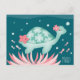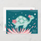 Carte postale "Sea Turtle Maui" illustrant une tortue de mer et une étoile de mer entourée de bulles, de poissons et de fleurs d'hibiscus. Il flotte dans l'océan de Maui, Hawaii.