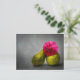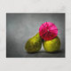 Vue rapprochée de deux poires derrière le parapluie de cocktail rouge. L'eau chute tout autour d'eux. Le ciel est gris et le temps est orageux