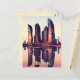 Une carte postale de voyage magnifiquement stylisée représentant l'emblématique horizon d'Abu Dhabi, avec ses gratte-ciel futuristes reflétant dans les eaux calmes au coucher du soleil. l'architecture incurvée et les teintes chaudes créent un paysage urbain fascinant qui capte l'essence de l'élégance moderne des EAU. parfait pour les amateurs de voyage, les amateurs d'architecture et ceux qui cherchent à commémorer leur visite à ce luxe destination.