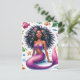 This vibrant fantasy postcard features watercolor artwork of a 'Black' mermaid surrounded by sea life. The dark brown-skinned mer creature poses on the sea floor with a beautiful smile, wearing a purple top. She has a scaly pink tail and is surrounded by fish, starfish, bubbles, and other ocean creatures and botanical elements. The beautiful mermaid has thick, long, naturally curly hair fanning out from her radiant, melanin-rich face in the underwater scene.