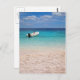 Carte postale d'un hors-bord dans l'eau bleu turquoise de la mer Méditerranée à la petite plage blanche de Cala Goloritze dans le golfe d'Orosei, Sardaigne, Italie.