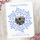 Ajoutez votre propre photo à ce design moderne et moderne scandinave de fêtes de couronne de fleurs bleu et blanc. Ça fait une belle famille. Modifiez le message d'accueil et le nom pour personnaliser. Crédit photo : Photographie © Storytree Studios, Stanford, CA