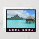 Carte postale de photo d'une lagune bleue de luxe de station de vacances de pavillon d'overwater en clair de l'île du Pacifique de Bora Bora, près du Tahiti en français la Polynésie française avec un bord noir et dans une barre noire le texte rose : "Bora Bora".