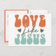 Remontez aux années 70 super avec cette carte postale d'inspiration rétro avec un arrière - plan blanc et un design amusant illustré. Les teintes pâles des polices orange et verte dégagent des vibes vintages majeures, tandis que le message "Amour comme Jésus" ajoute une signification spirituelle. Que vous soyez un fan de design rétro ou simplement à la recherche d'une façon unique d'envoyer des images positives à vos proches, cette carte postale est sûre de faire une déclaration. Ne manquez pas d'ajouter ce morceau de nostalgie à votre collection !