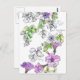 Une jolie carte postale avec une page du journal de la nature de pétunias pourpre lavande en stylo noir et encre et aquarelle.