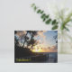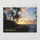 Une photo du soleil se levant à Dania Beach, en Floride. Il y a des silhouettes de palmiers et de raisins de mer ; on aperçoit également une promenade qui mène à l'océan. Dans le coin inférieur gauche de la carte postale est le nom de l'emplacement, dans une police jaune.