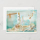 Magnifique collage aqua de sable de plage magnifique, coquillages, voilier de jouets, filet de poisson, phare, et un message dans une bouteille. Aquarelle Aqua en arrière - plan.