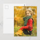 Carte postale photo élégante de Thanksgiving avec une belle typographie cursive blanche sur votre photographie d'automne. Cette carte pliée de photographie de famille moderne d'automne présente une belle écriture et votre nom en blanc sur l'image de vacances saisonnière à fond perdu.