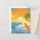 Design rond d'une scène de plage avec une petite île arborant un palmier et une planche de surf qui s'élève du sable, entourée de vagues bleues sous le soleil couchant. Cette carte postale est entièrement personnalisable.