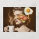 Une femme tient une tasse à café et un petit-déjeuner d'avocat et de toast à la tomate et un flotteur d'oeuf frit dans l'air surreal art