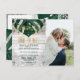 Elégante, rustique, et campagne plage tropicale Swiss Cheese Monstera feuilles sur bois blanc rustique et dentelle avec fausse impression feuille d'or typographie été Enregistrer le mariage de date Cartes postales. Ce design classique et sophistiqué est parfait pour le couple marié branché et élégant. Personnalisez avec votre propre message sur l'avant ainsi qu'avec un premier monogramme customisé sur l'arrière. Toute la conception d'impression photo.