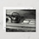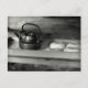 Photo en noir et blanc d'un plateau portant une théière et des bols, prise dans un sanctuaire japonais.