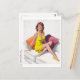 Carte PinUp classique montrant une fille PinUp en robe jaune mettant ses pieds sur le canapé, peinte par Arthur Sarnoff (1912-2000)