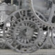 Un design photographique des roues d'un modèle très précoce d'un train à vapeur.