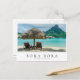 Carte postale de deux chaises longues sous un parasol en chaume sur une plage avec vue sur l'île de Bora Bora, Tahiti, Polynésie française avec en boîte blanche le texte : "Bora Bora, Polynésie française".
