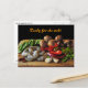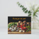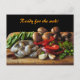 Cette carte postale présente une photographie d'art des ingrédients pour un délicieux sauté de légumes et de fruits de mer. Pois verts, champignons Crimini marron, poivrons rouges tranchés, échalotes hachées, gousses d'ail et crevettes crues sont empilés sur une planche à découper, prête pour le travail! Le texte peut être customisé ou supprimé.