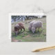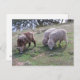 Trois moutons broutant dans un pâturage (deux blancs, un brun et un blanc). La partie supérieure de l'image est les arbres reflétés dans le plan d'eau.
