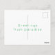 Tropical palm tree card with bright green and yellow design and a centered “Greetings from paradise” message inside.