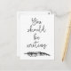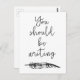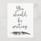 Carte postale en noir et blanc inspirante pour un auteur, publié ou aspirant, avec "Vous devriez écrire" dans une police de caractères à la main au-dessus d'une surface.
