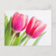 Carte postale avec une belle photo de printemps avec 2 tulipes roses et des feuilles vert vif.