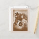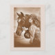 Photo vintage d'une femme en robe tzigane caressant son cheval. Cela se fait dans des tons sépia riches.