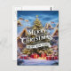 Une carte de Noël festive avec un sapin de Noël joliment décoré entouré d'une pile de cadeaux colorés.