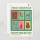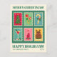 Cette carte de Noël offre des timbres de Noël rétro avec des lollipops, un arbre de Noël, des images de gâteau de sucre de canne, de vin et de rennes, et des textes de typographie rétro "Joyeux Noël" et "Joyeux Fêtes". Personnalisez-le avec votre nom et votre année.